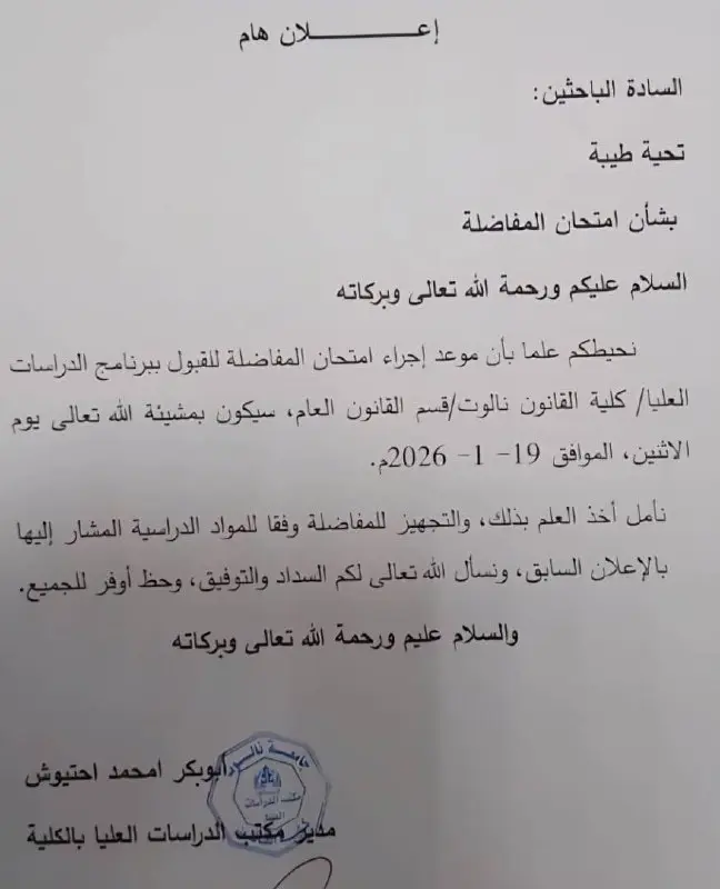 يعلم مكتب الدراسات العليا بكلية القانون نالوت السادة الباحثين الراغبين في الالتحاق ببرامج الدراسات العليا (الماجستير) للعام الأكاديمي 2025/2026م، بأنه سيتم – بعون الله تعالى – إجراء امتحان المفاضلة العلمية للقبول يوم الاثنين الموافق 2026/01/19م.